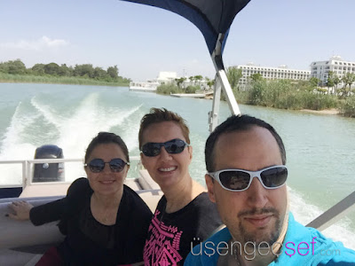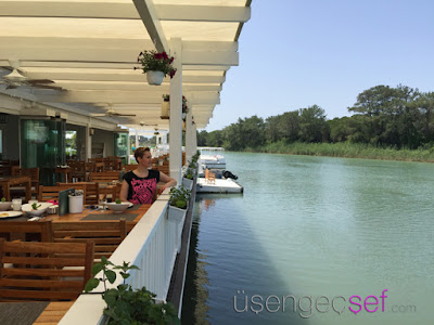 Bu arada Belek'teki bu yeni otelin içinde, enfes su böreği, lahmacunu, döneri ve pidesiyle meşhur bir Snack Bar olan Stella'daki manzarama bakar mısınız? Hemen buradan katamaran gibi tekneler kalkıyor ve 7-8 dakikalık bir nehir gezisiyle sizi, kendilerine ait devasa bir kumsala götürüyor.