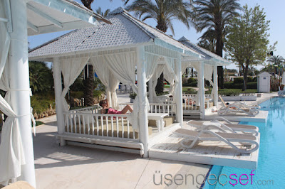 Tam da bu burnun karşısındaki, havuzun yanında yer alan loca gibi hazırlanmış “özel güneşlenme bölümleri” benim oteldeki favori mekanım oldu doğal olarak:)