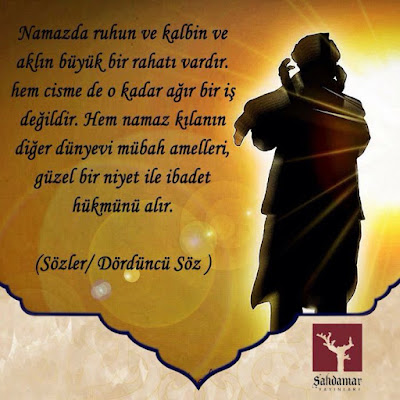 Keyf için, ebedî dünyada kalacak gibi nazlanıyorsun. Eğer anlasa idin ki, ömrün azdır hem faidesiz gidiyor. Elbette onun yirmidörtten birisini, (5 vakit namaz, abdestle birlikte günde bir saatimizi alır) hakikî bir hayat-ı ebediyenin saadetine medar olacak (sonsuz hayatın mutluluğuna sebep olacak)bir güzel ve hoş ve rahat ve rahmet bir hizmete sarfetmek (NAMAZA); usanmak şöyle dursun, belki ciddî bir iştiyak ve hoş bir zevki tahrike sebeb olur.