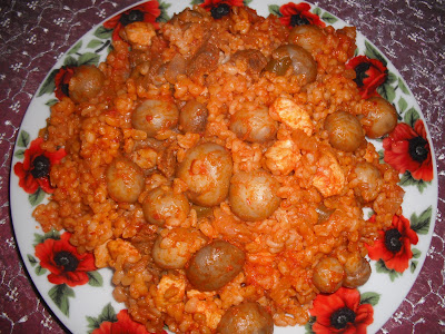 1 kase pilavlık bulgur 1 kase koyun kuşbaşı 1 kase tavuk bonfile kuşbaşı (az kol yağı ile kavrulmuş) 1 çorba kaşığı tereyağı yarım çay bardağı sıvı yağ 1 çorba kaşığı biber salçası, 1 çorba kaşığı domates salçası 1 adet sivri biber 4 adet yeşil soğan 1 adet iri kuru soğan 2 adet domates 1 kavanoz mantar tuz- kırmızı pul biber - karabiber Servis önerisi: yarım demet yaş nane Tenceremize yağı alalım kızınca eti katalım kavuralım. Etler pembeleşince ince kıydığımız soğanları katıp kavuralım. Ardından ince doğranmış sivri biberi biraz çevirip iri doğranmış yeşil soğanları kavuralım, biber ve domates salçalarını ilave edip karıştıralım ve bire iki sıcak suyu ve tuzu katıp bir taşım kaynatalım ve yıkanmış bulguru, küçük doğranmış domatesleri katalım karıştıralım tencerenin kapağını kapatıp pişmeye bırakalım. Pilav göz göz olunca kavrulmuş tavuk etini, yıkanmış süzülmüş tüm tüm minik mantarları katalım, tencerenin kapağını kapatalım. Suyunu çekince ocağı söndürüp baharatlarını ve ince kıyılmış taze naneyle tatlandıralım ve pilavımızı dinlendirip servise sunalım. Afiyet olsun...